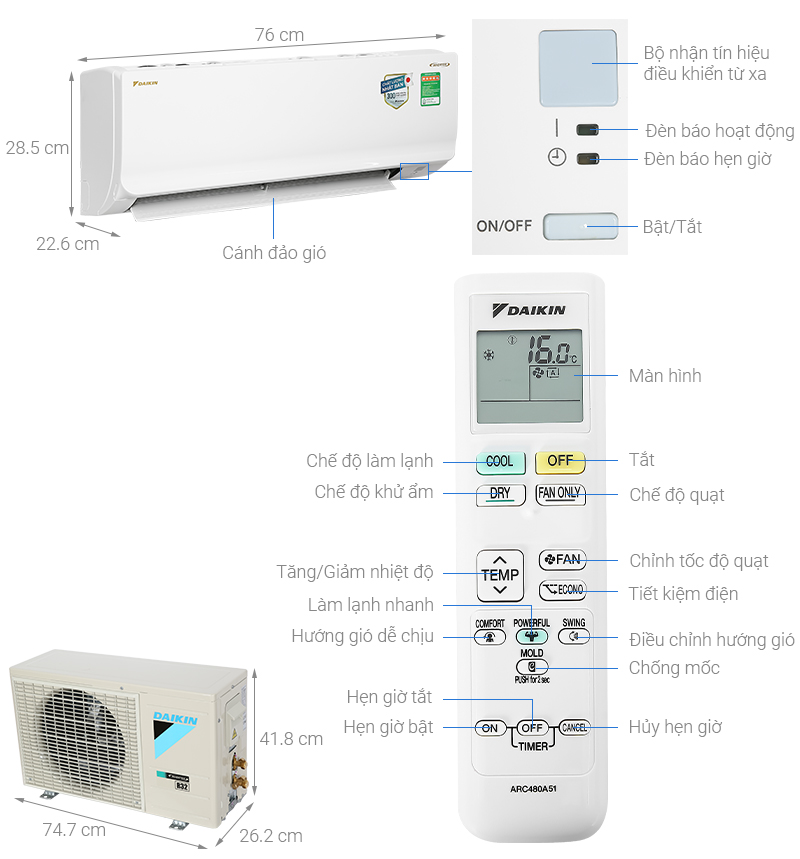 - Sử dụng cơ chế điều khiển lên xuống tự động, trái phải tùy chỉnh tay giúp hơi lạnh có thể di chuyển đến mọi nơi trong không gian phòng.