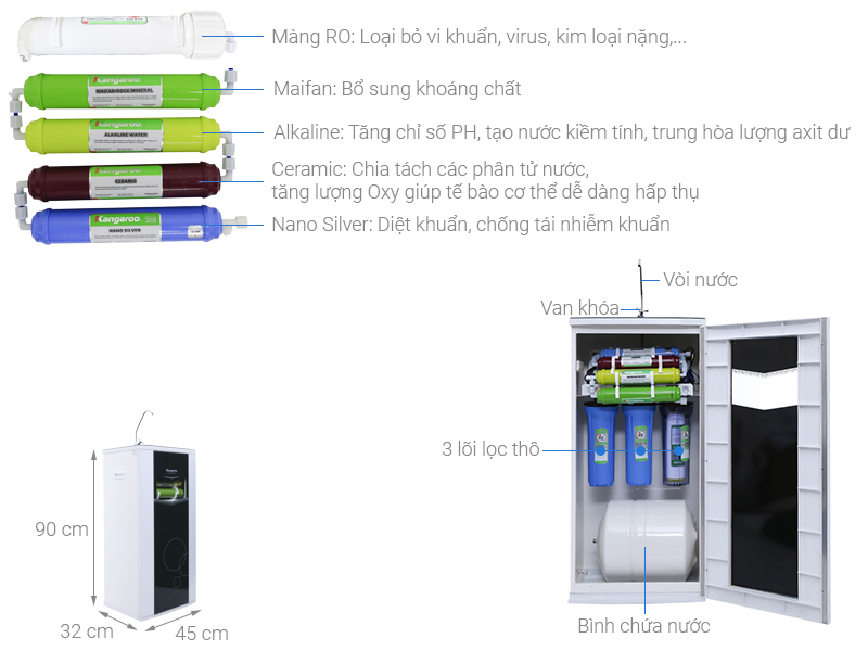 - 3 lõi lọc thô lọc sạch bùn đất, kim loại nặng, gỉ sét... hấp thụ clo, thuốc trừ sâu, thuốc bảo vệ thực vật... có trong nước.